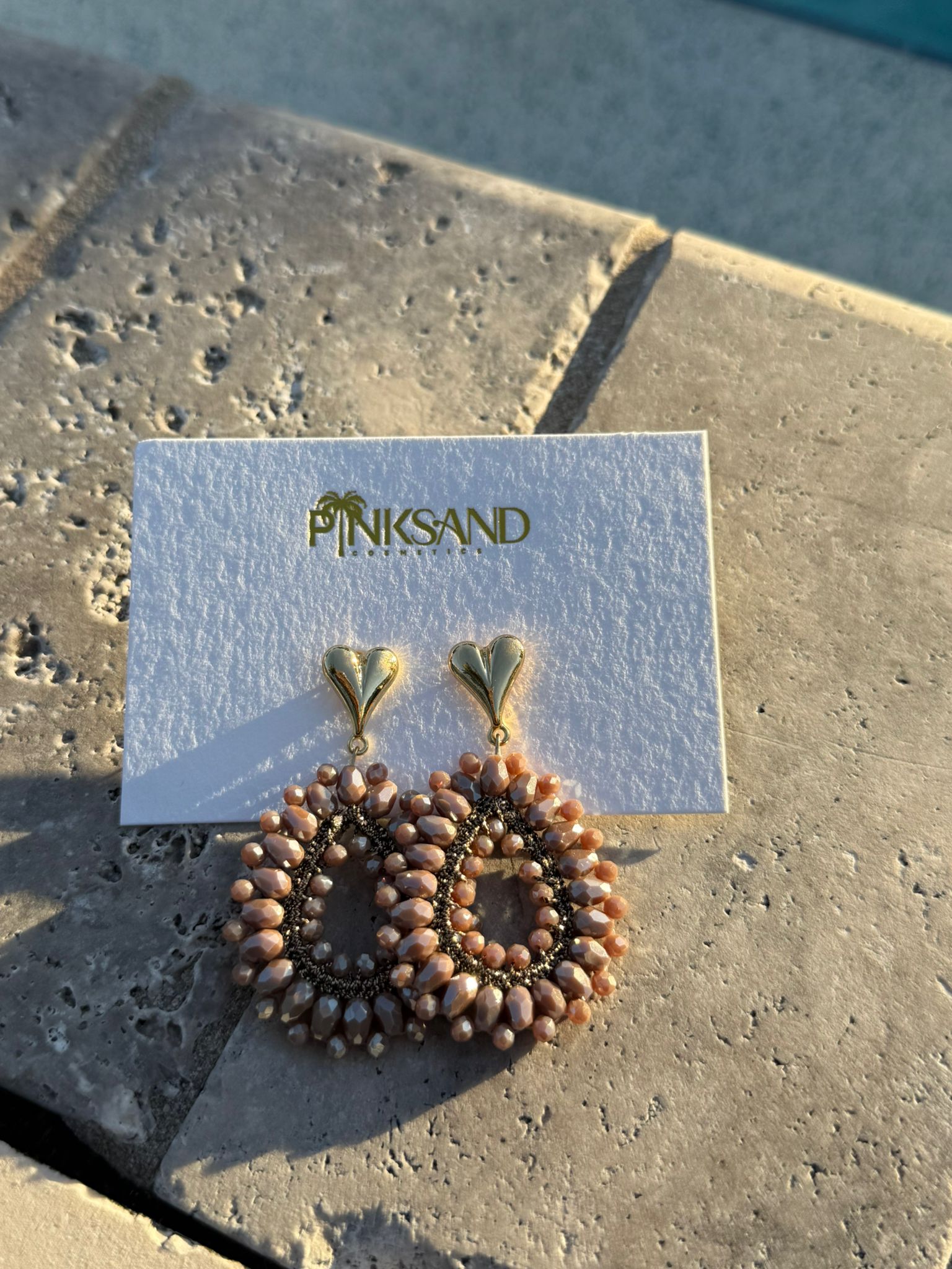 Make a statement with the Evening Glow Earrings, where elegance meets allure. These stunning earrings feature teardrop-shaped frames adorned with intricate, shimmering beads in a soft rose hue, perfectly capturing the essence of twilight radiance. Suspended from a polished gold heart stud, each earring is encircled by a delicate arrangement of faceted beads that catch the light with every movement. Ideal for both formal occasions and adding a touch of glamour to your everyday look, the Evening Glow Earrings are a versatile piece that embodies sophistication and warmth. Let your style shine with these radiant, eye-catching earrings.