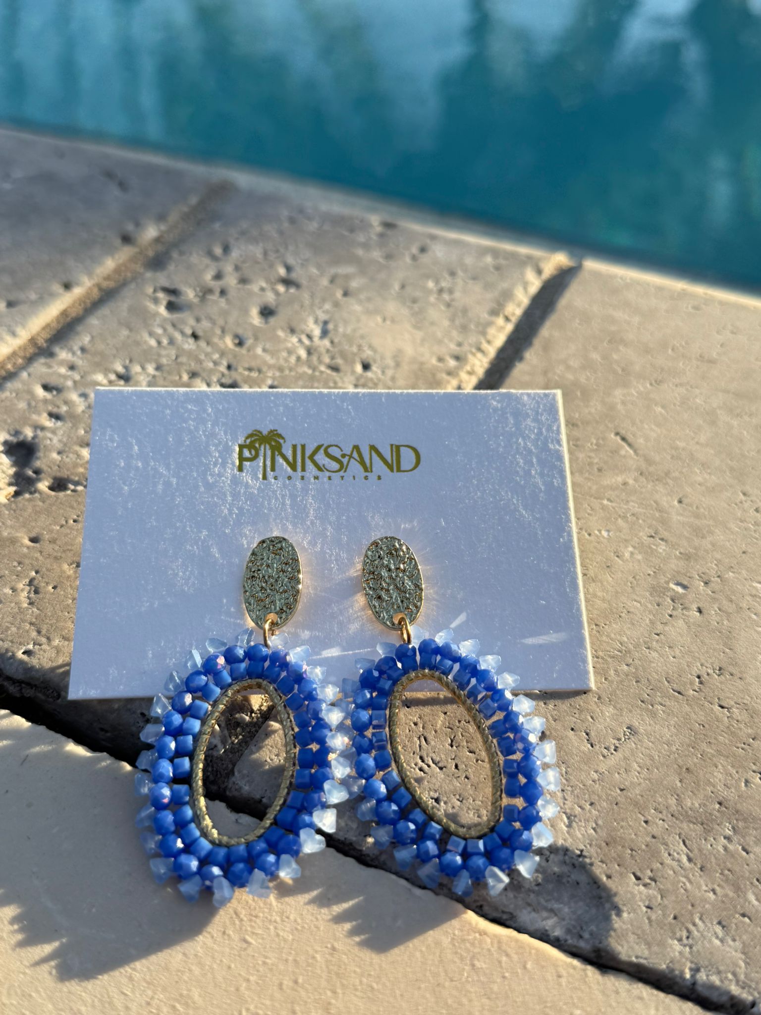 Dive into the depths of elegance with the Lagoon Luxe Earrings. These stunning earrings feature a brilliant blue beaded frame that encircles an open oval design, giving a subtle nod to the serene beauty of a lagoon. Accented with a golden textured stud, they offer a luxurious and refined look, perfect for any occasion. Lightweight yet eye-catching, the Lagoon Luxe Earrings add a splash of color and elegance to your ensemble, making them an essential accessory for those who love to make a statement in style.