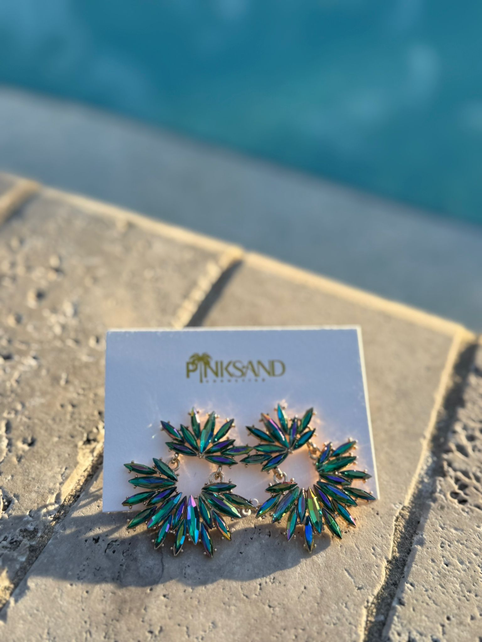 Add a touch of tropical elegance to your collection with the Palm Breeze Earrings. These stunning pieces showcase a mesmerizing arrangement of iridescent green marquise crystals radiating from a golden frame, evoking the lush beauty of palm leaves swaying in the breeze. Perfectly designed to capture light from every angle, these earrings bring a subtle yet vibrant shimmer, making them ideal for both daytime wear and evening glam. Let the Palm Breeze Earrings transport you to a tropical paradise with their sophisticated and striking allure.