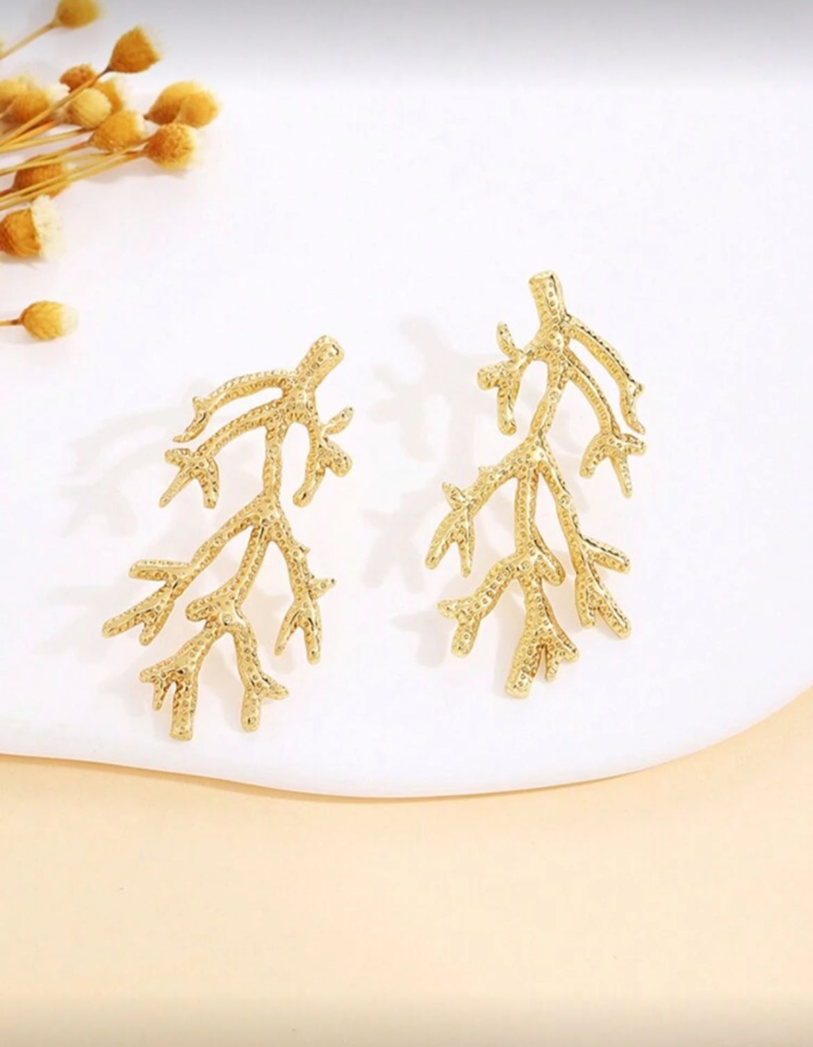 Reef Radiance - Dive into elegance with these captivating coral-inspired earrings. The intricate design and gold finish create a sophisticated and eye-catching look. Perfect for adding a touch of coastal chic to any outfit.