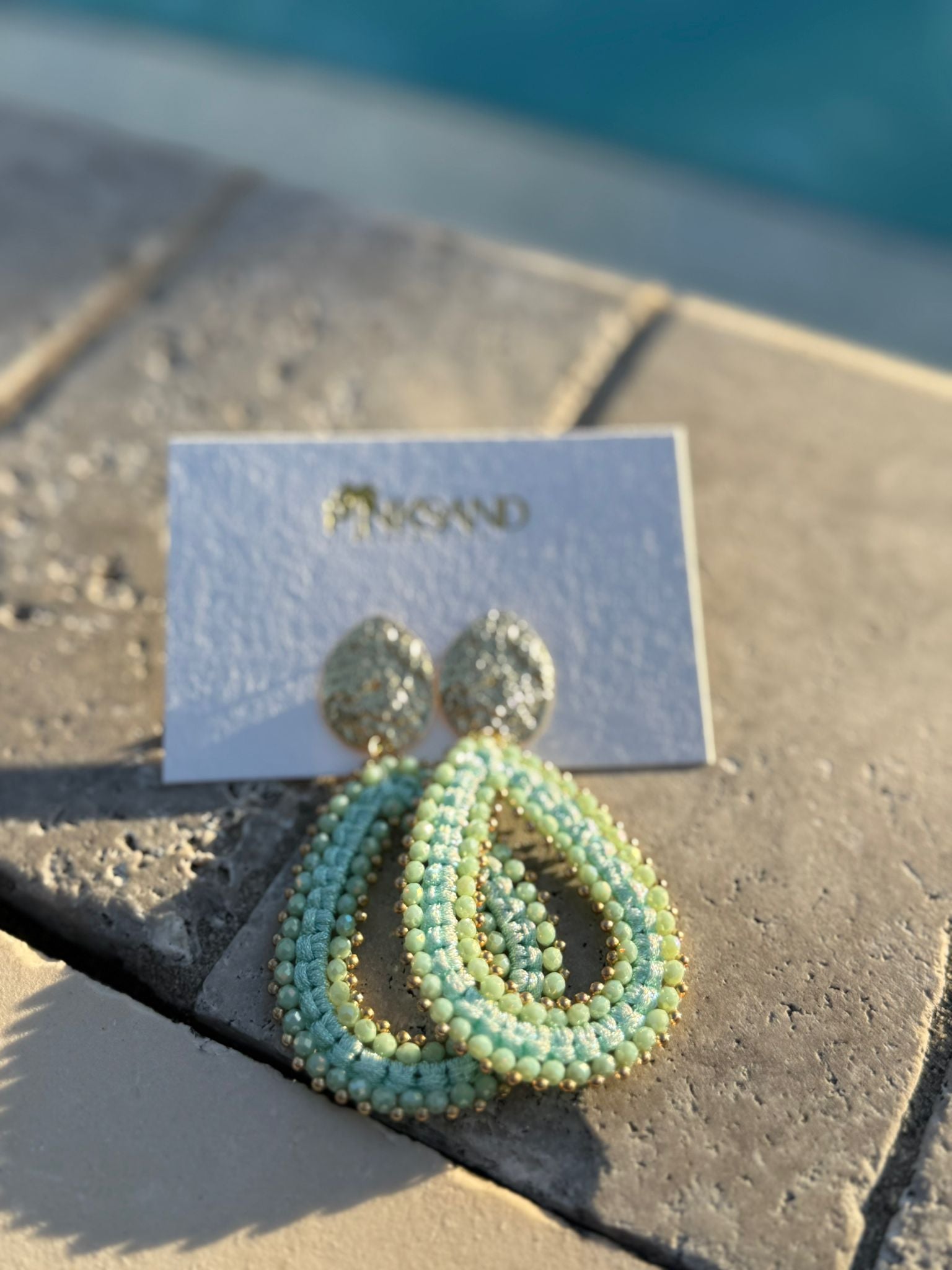 Dive into elegance with the Tidal Tear Earrings, a pair designed to reflect the beauty of ocean waves and sandy shores. These earrings showcase a unique teardrop shape, wrapped in soft aqua threads and outlined by shimmering gold bead accents. The golden, textured stud at the top provides a sophisticated anchor, blending beachy vibes with a touch of glam. Lightweight and versatile, the Tidal Tear Earrings are perfect for adding a splash of color and sophistication to any ensemble.